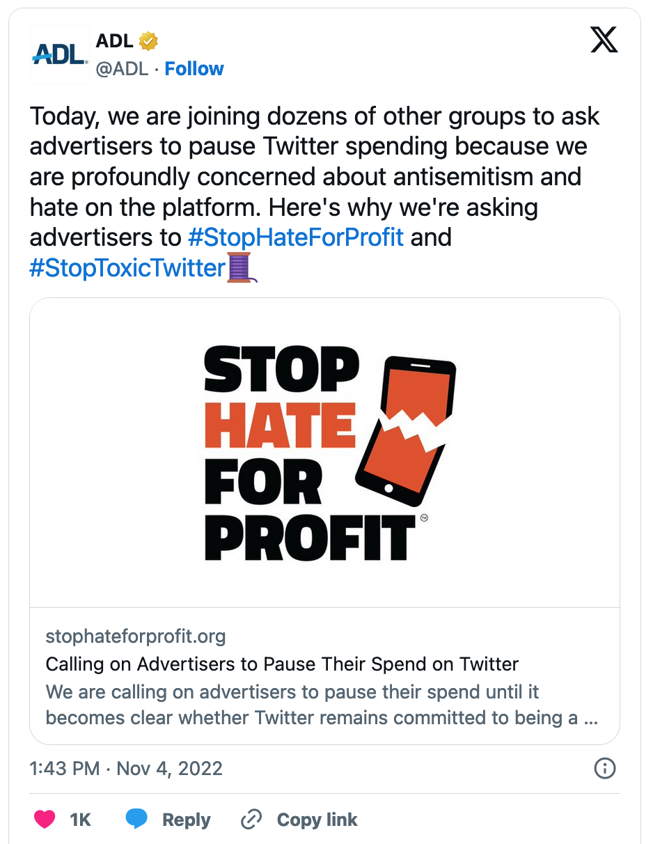 For it was on that date that the ADL publicly declared war on (a) the world’s wealthiest man, Elon Musk, and (b) Twitter, which he bought for $44 billion. The ADL claimed it instigated this war due to its alleged “profound concern about antisemitism and hate on the platform,” which it claimed was caused by Musk’s management decisions — in the eight days he had been running the site. On this basis — and for the first time ever — the ADL openly urged advertisers worldwide to abandon Twitter, with the clear intent to destroy the site, by starving it of the revenue upon which its survival depends.